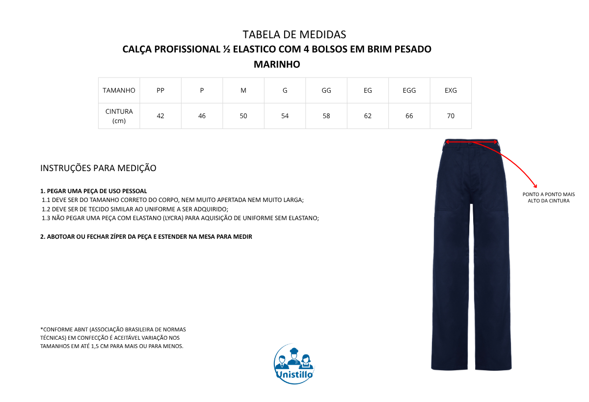 Calça Profissional em Brim/Sarja Pesado Marinho com Cintura com ½ Elástico. Projetada para unir resistência e conforto, esta calça profissional é confeccionada em brim/sarja pesado, garantindo alta durabilidade e excelente caimento. A cintura conta com ½ elástico na parte traseira, que oferece ajuste prático sem comprometer a aparência, além de permitir mobilidade durante toda a jornada de trabalho.