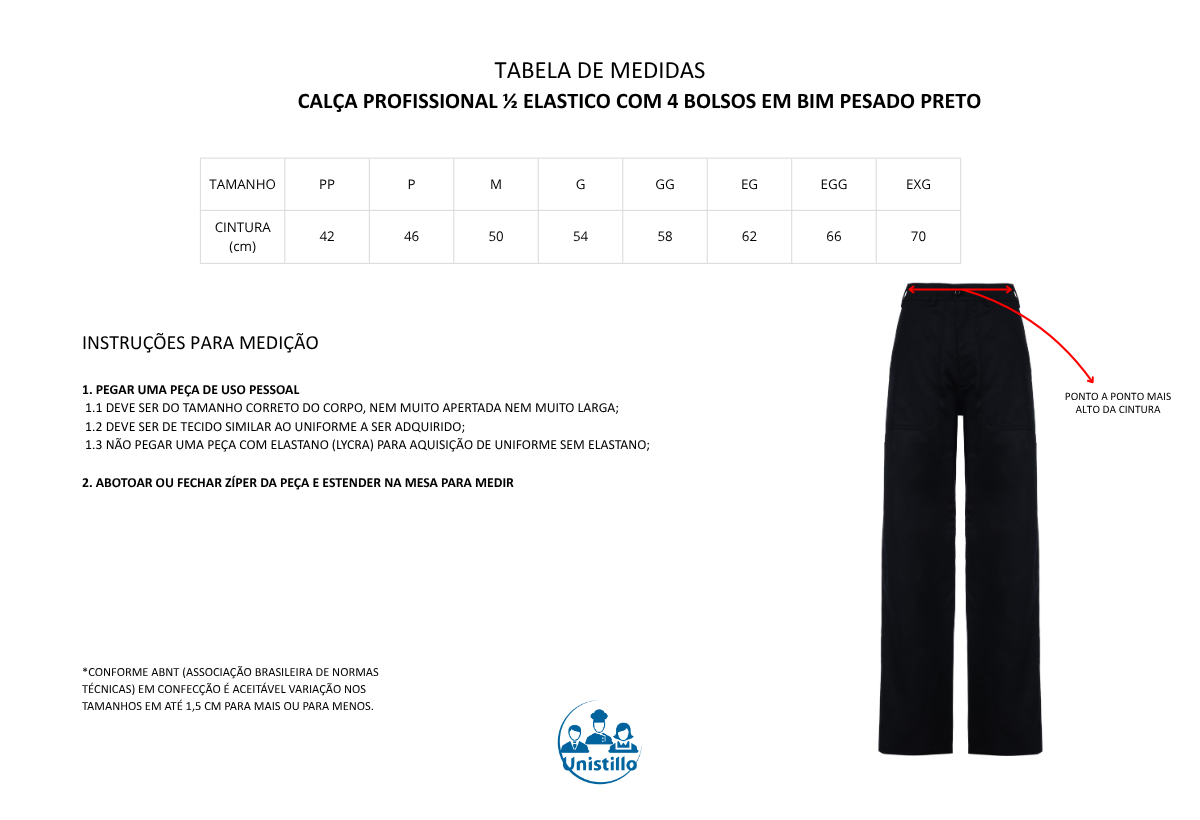Calça Profissional em Brim/Sarja Pesado Preto com Cintura com ½ Elástico. Projetada para unir resistência e conforto, esta calça profissional é confeccionada em brim/sarja pesado, garantindo alta durabilidade e excelente caimento. A cintura conta com ½ elástico na parte traseira, que oferece ajuste prático sem comprometer a aparência, além de permitir mobilidade durante toda a jornada de trabalho.