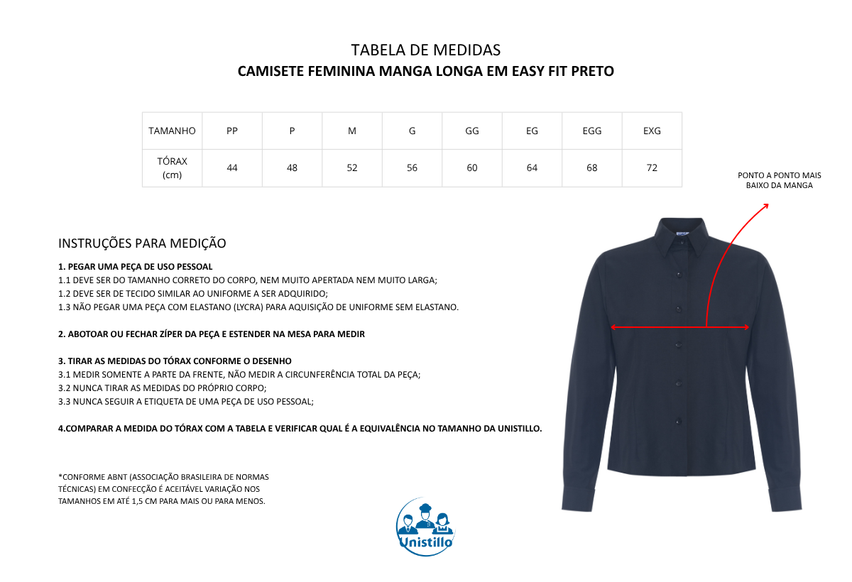 Camisete Feminina Manga Longa em Easy Fit Preto – Sem Aplicação. Prática e elegante, esta camisete feminina de manga curta é confeccionada em tecido Easy Fit, que combina leveza, toque macio e caimento impecável. O design clean, sem aplicações, oferece um visual sofisticado e versátil, perfeito para diferentes ambientes profissionais. A cor preta reforça a elegância e facilita a combinação com diversos uniformes.
