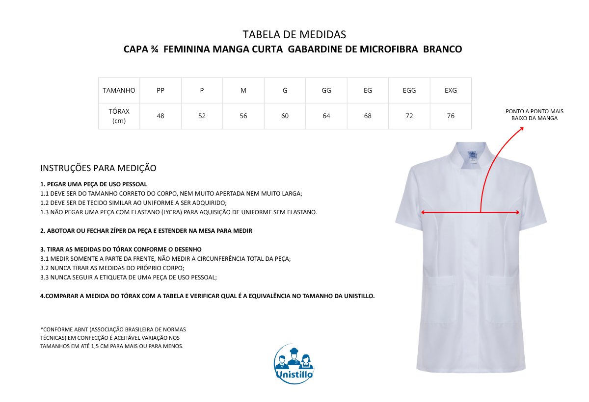 Capa 3/4 Feminina Manga Curta em Gabardine de Microfibra Branco. Elegante e funcional, esta capa 3/4 feminina de manga curta é confeccionada em gabardine de microfibra, tecido leve, resistente e de secagem rápida, que proporciona conforto e excelente caimento durante todo o dia. O comprimento 3/4 garante maior cobertura sem limitar os movimentos, enquanto a cor branca clássica reforça a aparência profissional em ambientes que exigem higiene e apresentação impecável.