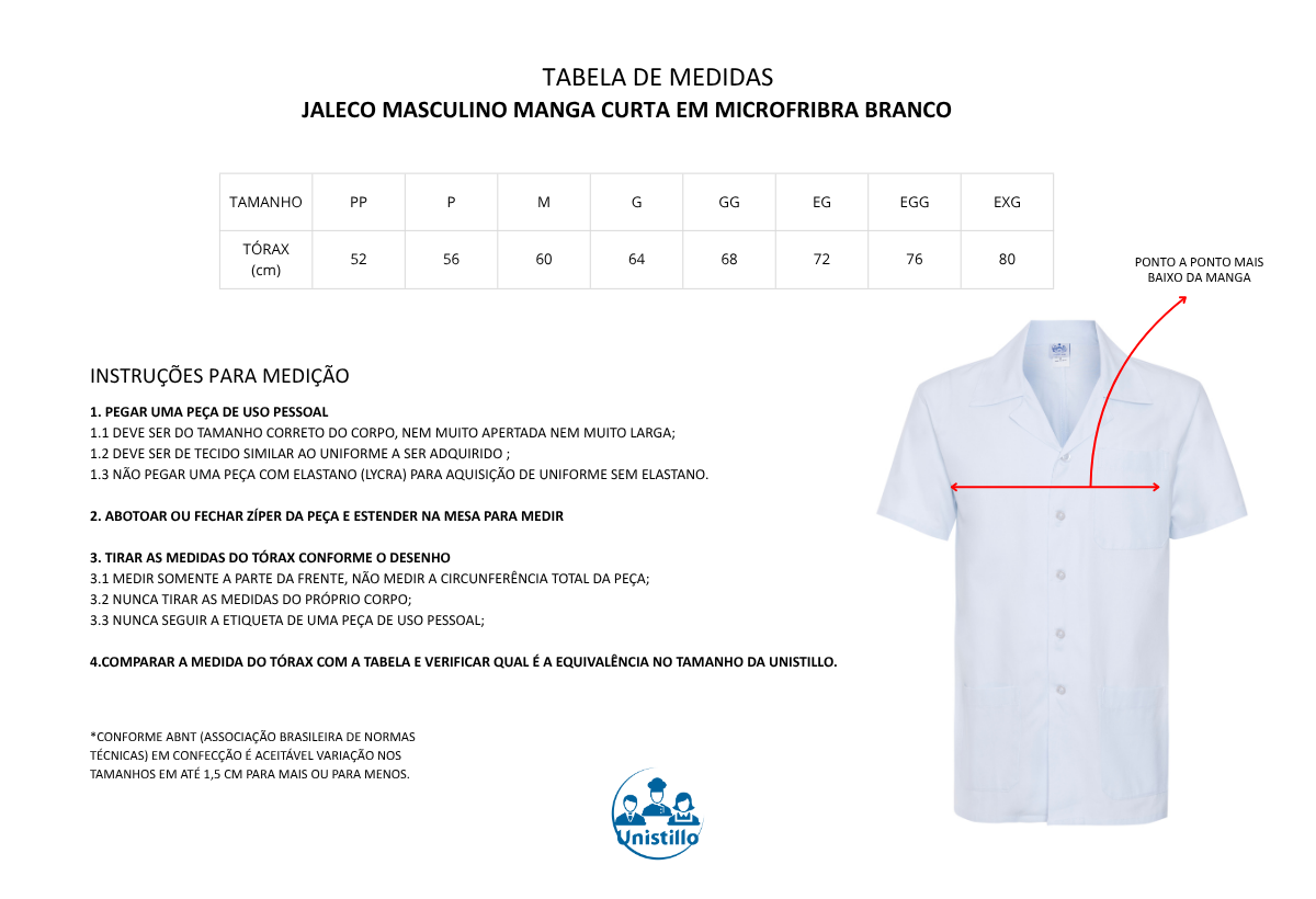Jaleco masculino manga curta em gabardine de microfibra branco. Profissionalismo e conforto em uma única peça. Este jaleco masculino de manga curta é confeccionado em gabardine de microfibra, tecido leve, respirável e de secagem rápida, que oferece durabilidade e caimento impecável. A cor branca garante um visual elegante e moderno, ideal para ambientes que exigem apresentação impecável sem abrir mão da praticidade.